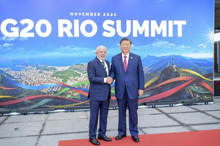 当地时间11月18日上午,国家主席习近平在巴西里约热内卢出席二十国集团领导人第十九次峰会。这是峰会开始前,习近平受到巴西总统卢拉热情迎接。新华社记者 李学仁 摄
