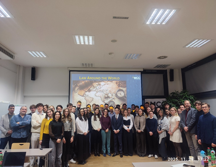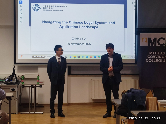2025年11月29日,中国国际经济贸易仲裁委员会(以下简称“贸仲”)欧洲仲裁中心秘书长助理付智星先生应邀在维也纳参与由匈牙利马蒂亚斯·科尔维努斯学院(MCC)主办的“全球法律专业营”教学活动。匈牙利前最高法院院长Péter Darák、米兰大学教授Luca Vanoni、MCC法学院院长Lénárd Sándor等欧洲专家学者亦出席本次活动并担任主讲嘉宾。