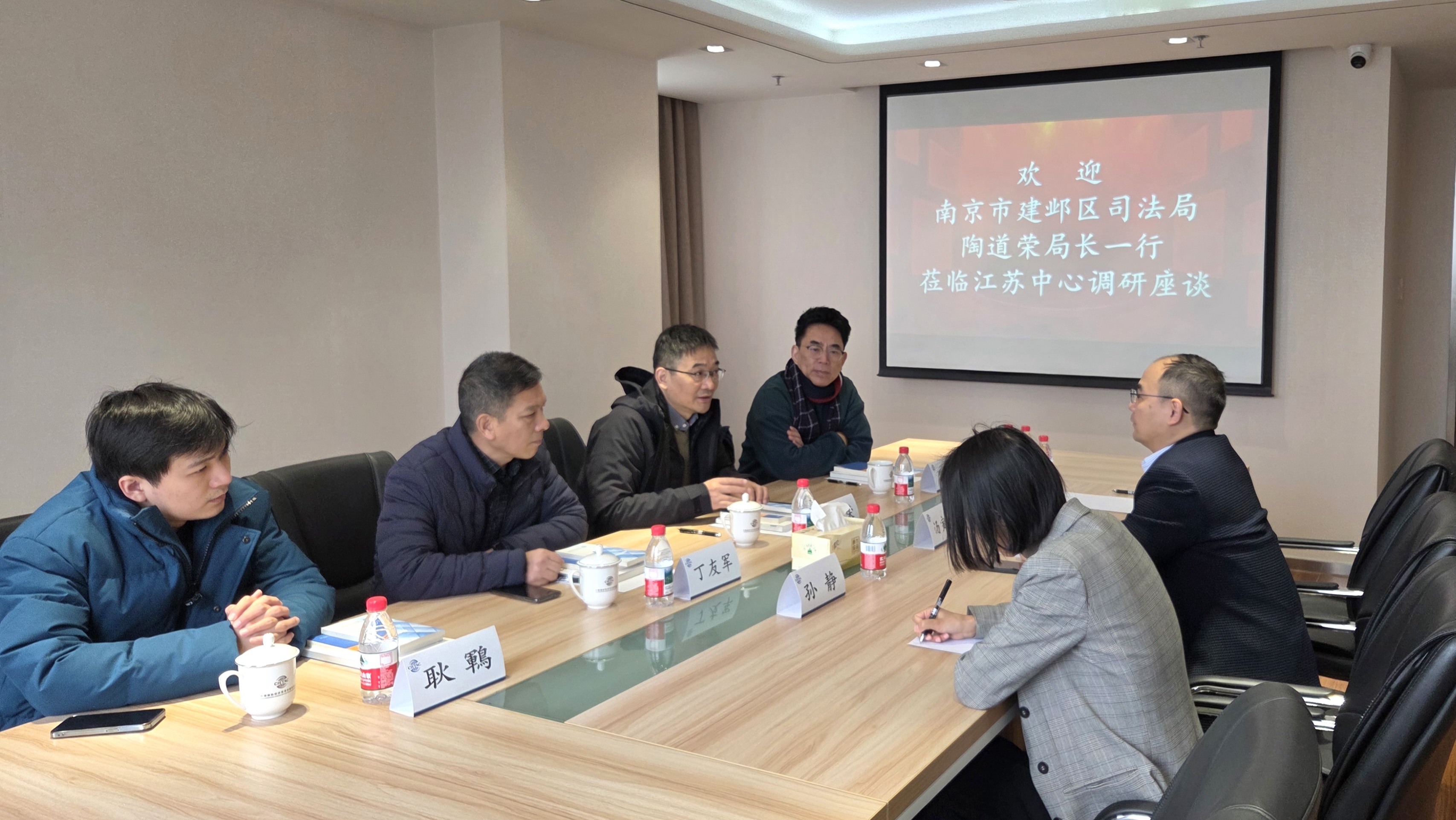 2025年12月23日,南京市建邺区司法局(以下简称“建邺区司法局”)局长陶道荣、副局长丁友军及江苏博事达律师事务所主任周连勇等一行到访中国国际经济贸易仲裁委员会江苏仲裁中心(以下简称“贸仲江苏中心”)开展调研,贸仲江苏中心副秘书长汤寅宏、秘书长助理孙静等接待并座谈。