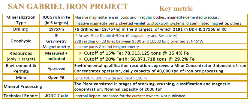 SAN GABRIEL OPERATIVA Fe  1100 Hectareas   Ambientales, explotación minera concesión estatal, todos al día, 1500 Ton/dia de producción de mineralal con mas de 62% de concentración de hierro  Adjunta PROPIETARIO  $74,5 Mills
