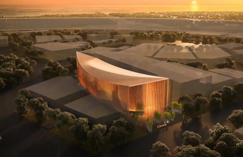 李庆霜介绍,中国馆建筑以古代重要文化传播载体—竹简为设计灵感,巧妙融合竹子、汉字、书卷等寓意丰富的文化符号,诉说中华千年历史,彰显非凡文化底蕴。