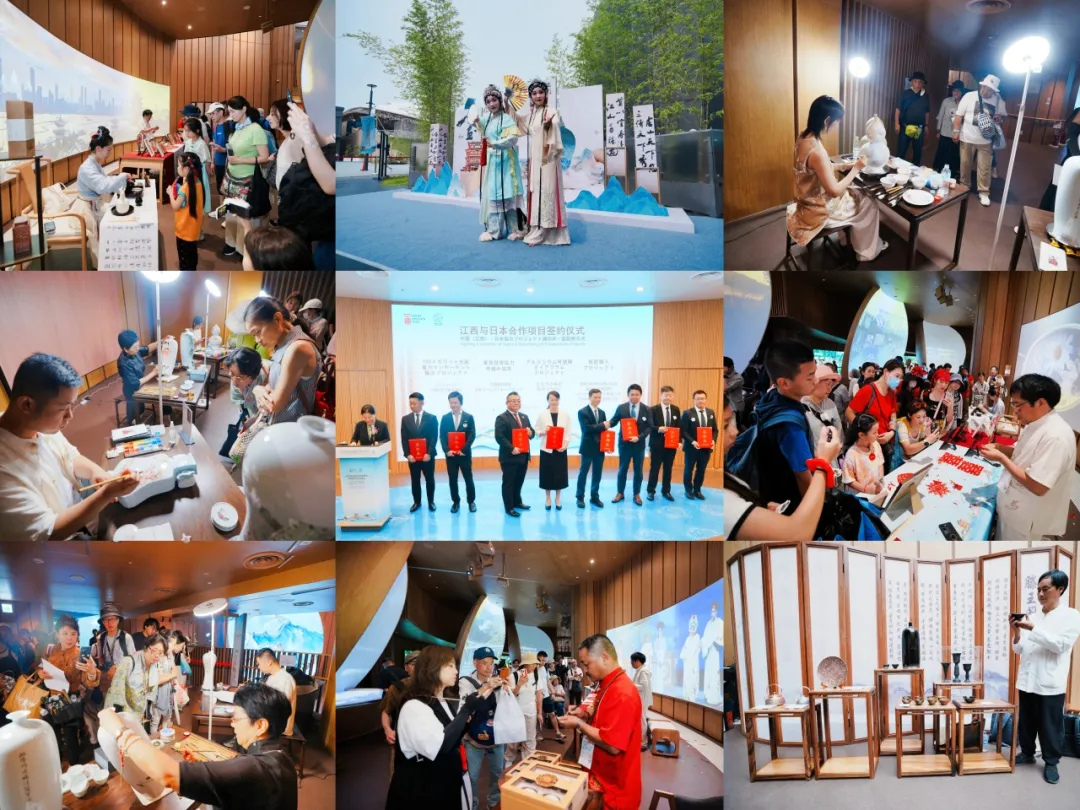 我省企业参与建设的中国馆 “竹韵书简”在竹影婆娑间,尽展江西高质量发展的绿色底蕴;《这就是江西》省情宣传片、中日英多语种展板娓娓道来,勾勒出江西人文的厚重、生态的灵秀、产业的勃发与开放的热忱。江西特色文创与活动日徽章备受青睐,非遗展演更添雅趣——抚州采茶戏水袖轻扬,唱尽赣鄱风情;景德镇手工制瓷技艺现场演绎,“白如玉、明如镜” 的瓷韵令人沉醉;宜春金片禅茶制作技艺一展禅茶一味的清幽;靖安黑陶古法柴烧、薄胎黑亮,重现千年神韵;贵溪錾铜以錾代笔、铜为纸、力作墨,在千锤万凿中展现赣鄱工匠的浓浓匠心;新干剪纸、乐安蛋雕妙手生花,尽显民间巧思;体验区里,观众或化戏妆、书汉字,或剪红纸、刻蛋雕、品禅茶,于指尖与舌尖的交融中,感受江西非遗的千年匠心。“菜模”展陈的“十大赣菜”与“十大名小吃”,让“江西美如画,赣菜香天下”的美誉远播。活动当日,日本驻华大使金杉宪治也到馆参观非遗展演展示,并饶有兴致地与非遗传承人展开互动交流。