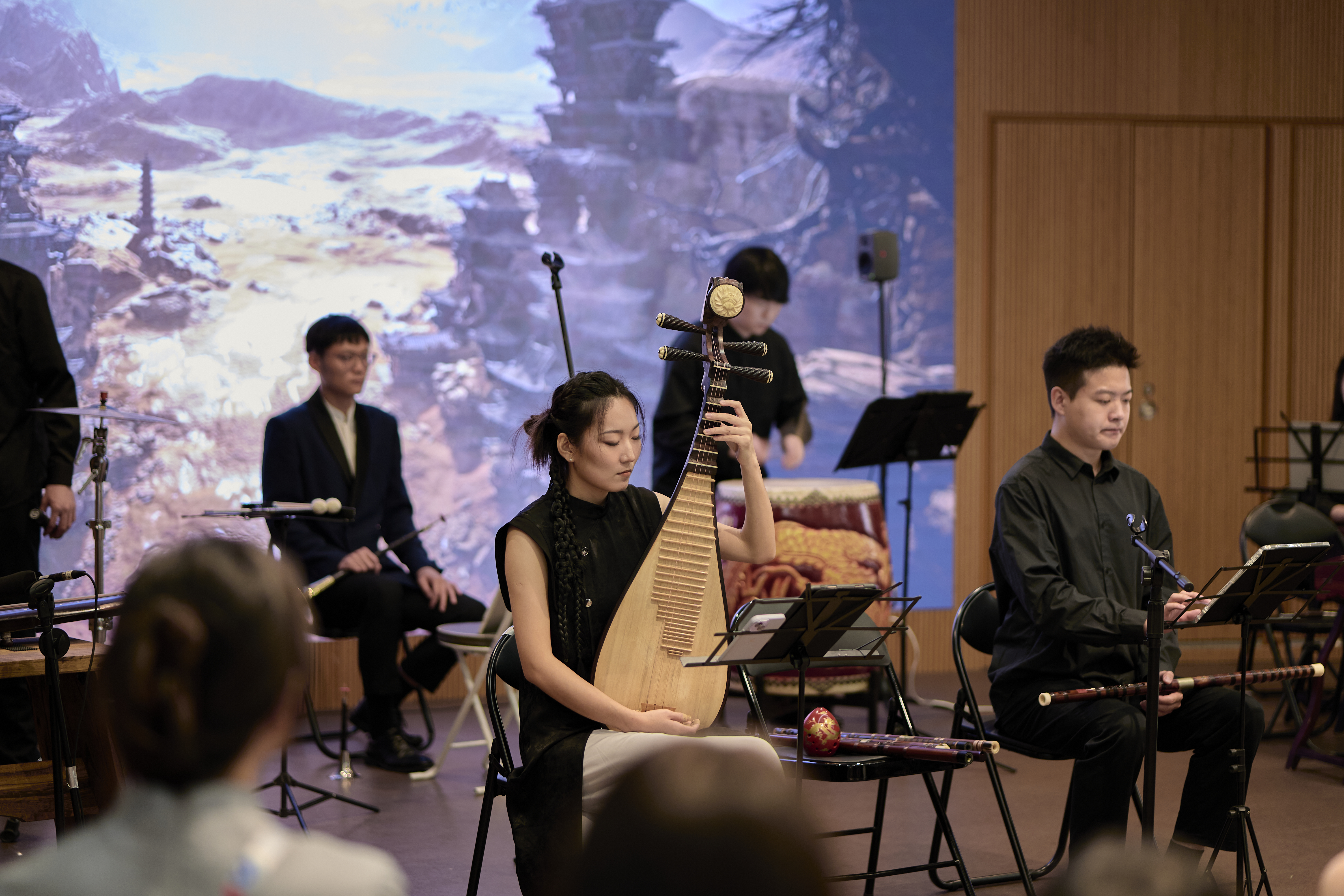 在中国馆多功能厅中,精彩的演出依次亮相。来自《黑神话:悟空》的音乐作品率先将现场点燃,歌曲原唱熊竹英老师以陕北说书唱腔演奏歌曲《黄风岭》,高亢的民族特色音乐迅速感染了现场多国观众。《黑神话:悟空》游戏主题曲配合现场大屏展示游戏影像资料,用音乐带大家回顾了游戏一路走来的开发历程。