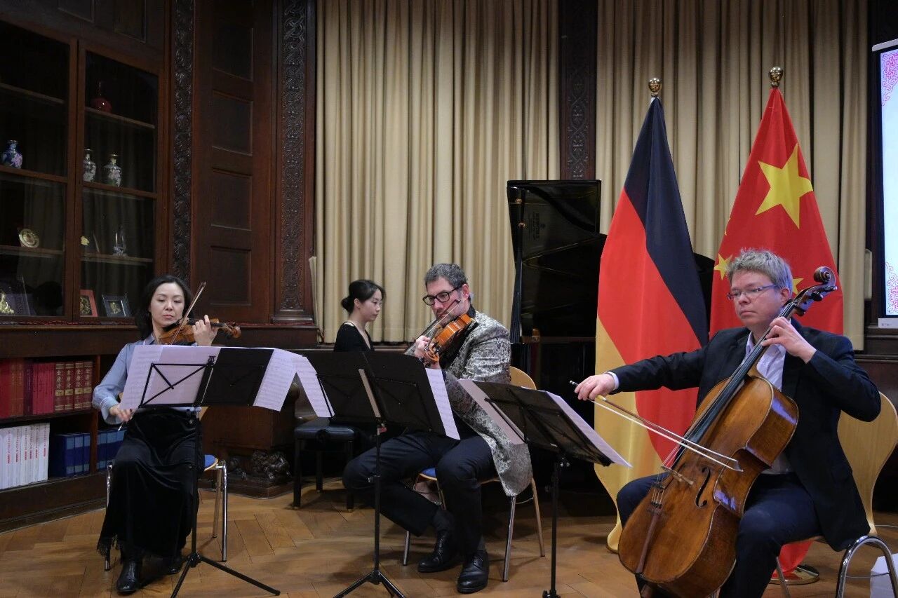 招待会现场气氛温馨友好。来宾们在中国美食与德国热红酒的暖意中共叙友谊、畅谈合作。来自法兰克福广播交响乐团的艺术家演奏了《彩云追月》《茉莉花》《降B大调三重奏》《花之圆舞曲》等中外曲目,赢得阵阵掌声。