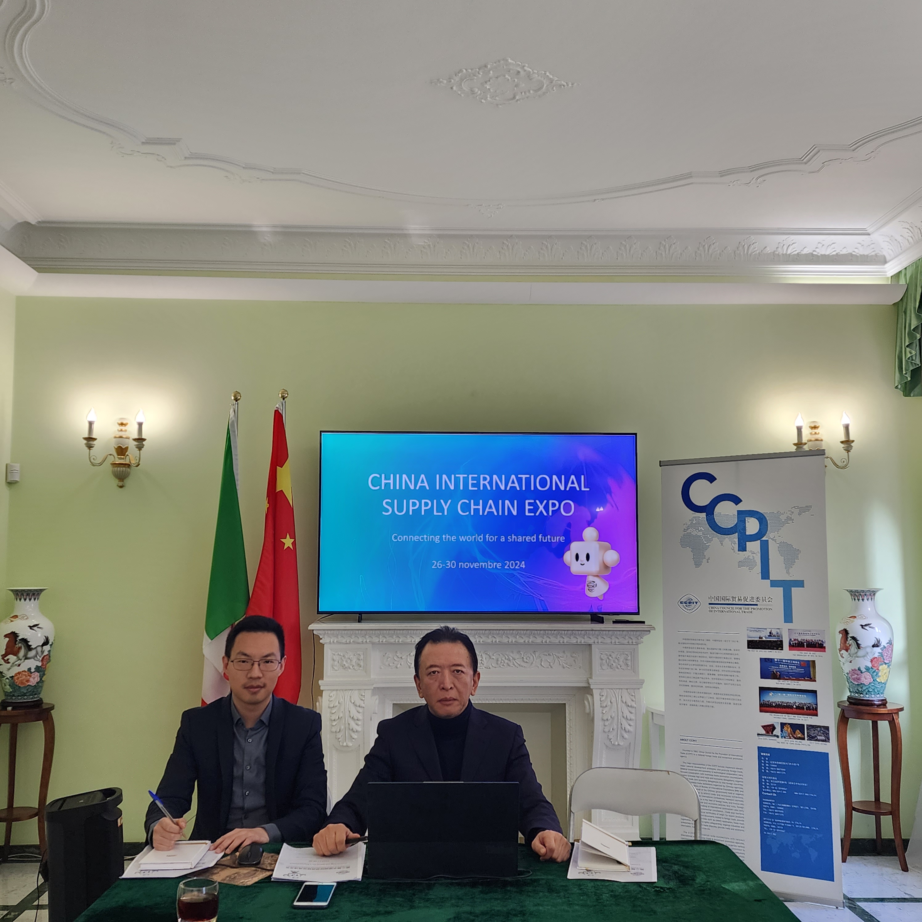 3月7日,驻意大利代表处总代表姚鲁杰会同中国意大利商会北京办公室负责人Federica Viggiani、意大利业务合作经理Valentina Rigoni举办第二届链博会线上推介会。