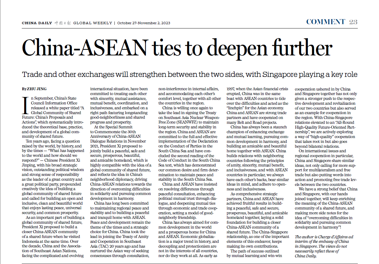 10月27日,朱憬临时代办在《中国日报》发表题为《和衷共济 和合共生,携手构建更为紧密的中国东盟命运共同体》署名文章,阐释《携手构建人类命运共同体:中国的倡议与行动》白皮书的核心内容,介绍中国和东盟共建“五大家园”取得的丰硕成果,展望中国东盟命运共同体内涵不断丰富、合作更加深入的未来。文章译文如下: