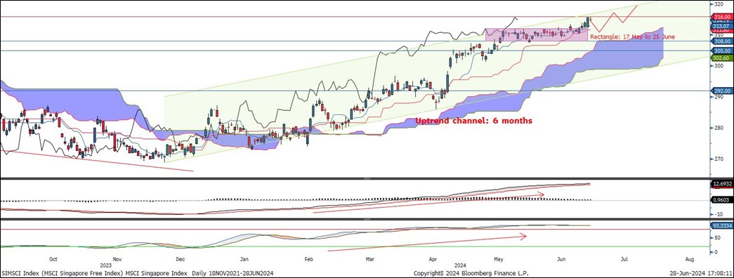 在突破 307.95点至312.20 点的盘整区间(2024 年 5 月 17 日至 6 月 25 日)后,MSCI 新加坡指数较预期提前接近我们的长期目标 316.50 点(请见我们于 2024 年 5 月 31 日发布的策略报告),这可视为看涨的延续形态。自从于 2023 年 12 月从 268.72 点的低点反弹以来,MSCI 新加坡指数的上升趋势在过去 6 个月中保持完好,我们认为在未来 3-6 个月很可能会保持上升轨迹。因此,基于强劲的看涨势头,我们将该指数的长期目标(6 个月)上调至 322 点。假如指数于 2024 年 7 月出现调整,反弹的主要支撑位在 312.20 点和 305.00 点。