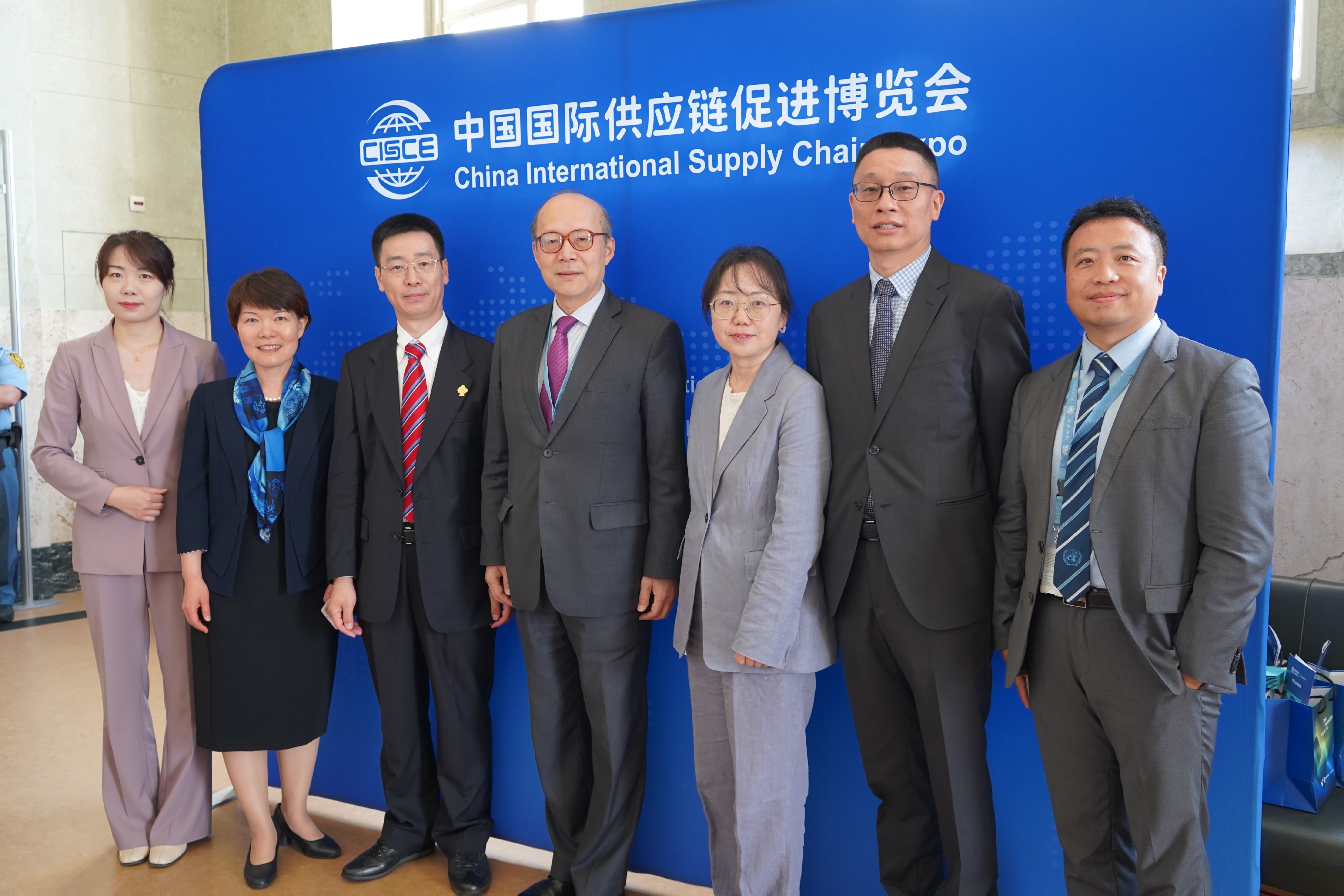 研讨会前后,有关领导在链博会背景板前同工作人员合影留念,向与会嘉宾介绍情况、为链博会代言。代表处通过参加本次活动,集中向国际组织和日内瓦各国常驻团展示和宣传链博会,取得良好效果。